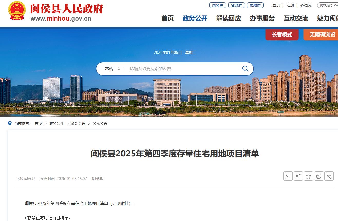 海西房产网(微信公众号:fjhxfcw)消息:2026年1月5日,闽侯县人民政府官网发布“闽侯县2025年第四季度存量住宅用地项目清单”。