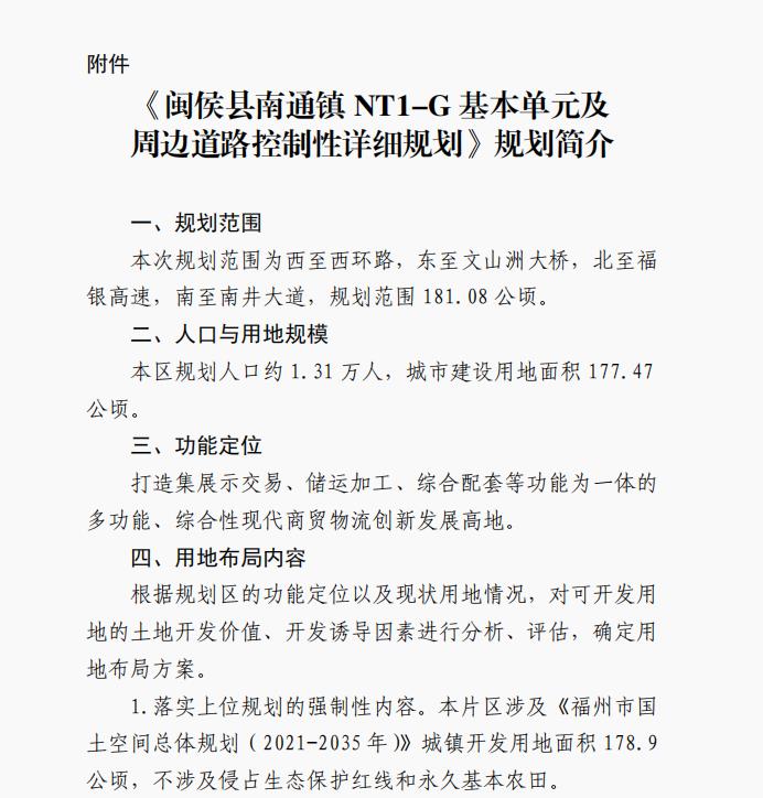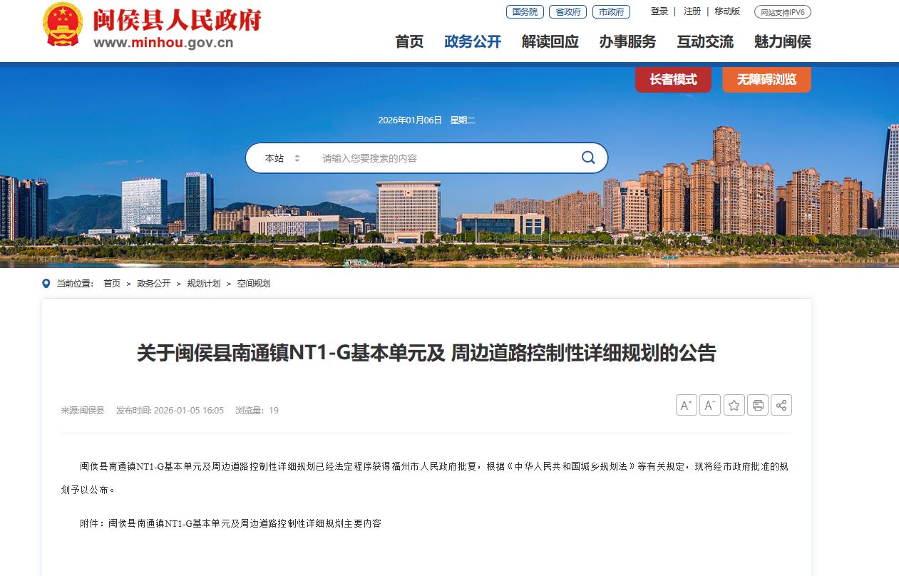 2026年1月5日,闽侯县官网发布“关于闽侯县南通镇NT1-G基本单元及周边道路控制性详细规划的公告”。