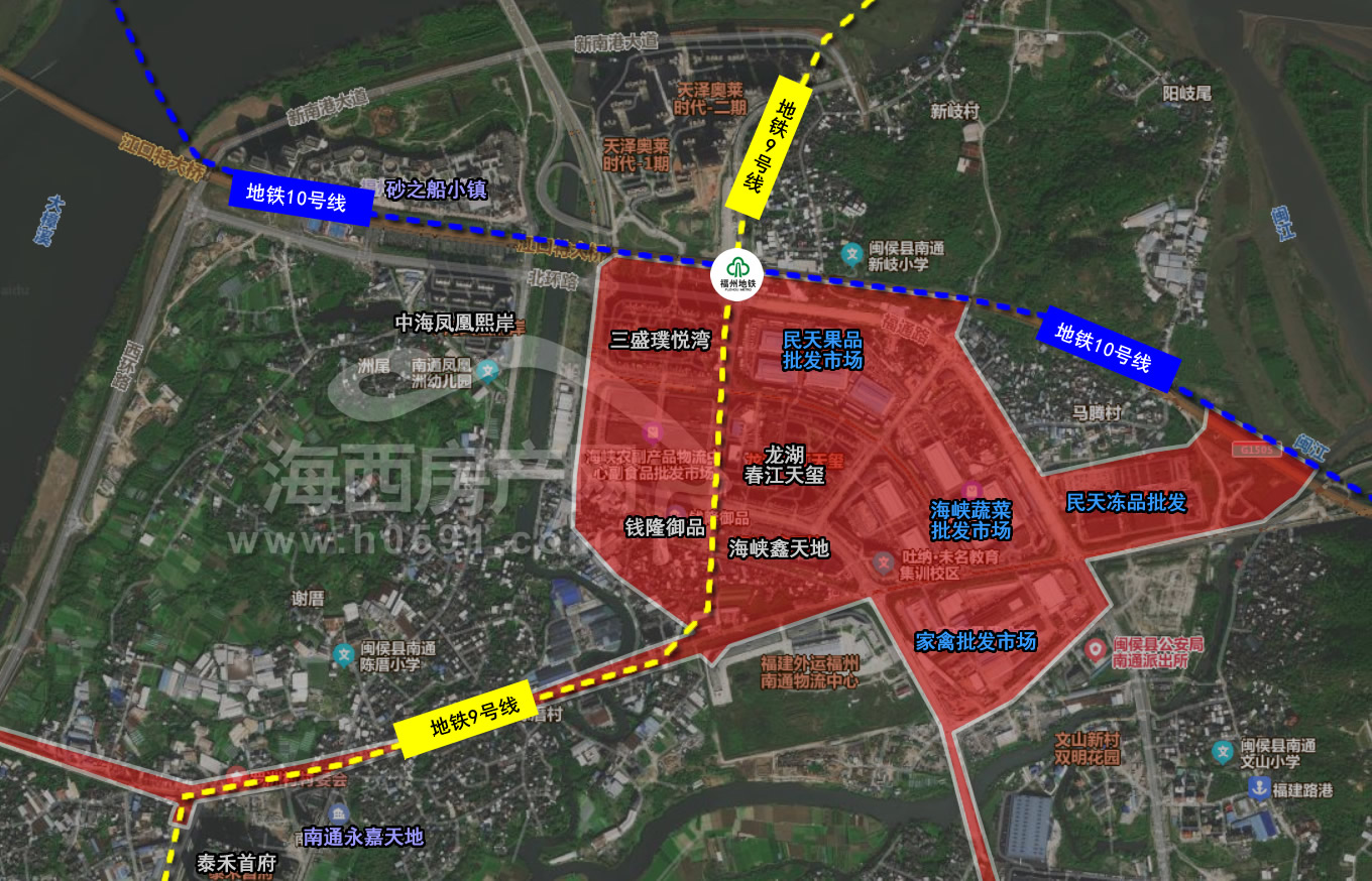 其中,地铁9号线跨乌龙江,由北向南,经过天泽奥莱时代,经兴腾路后向西,经南港大道后,在南通永嘉天地处,沿着罗洲南路,一直向南至规划的福州南站。