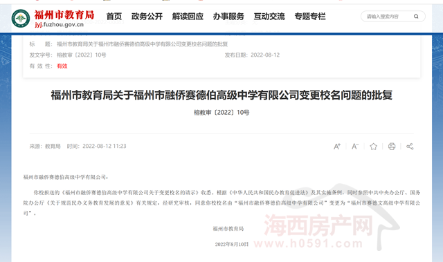 早在2022年8月12日,福州市教育局发布“关于福州市融侨赛德伯高级中学有限公司变更校名问题的批复(榕教审〔2022〕10号)”。
