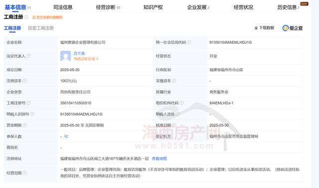 爱企查资料显示,福州霖德企业管理有限公司成立于2025年05月30日,注册地位于福建省福州市仓山区闽江大道167号融侨水乡酒店一层,法定代表人为方兰英。
