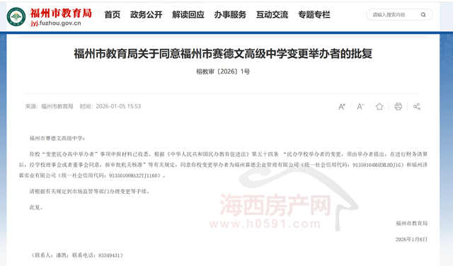 海西房产网(微信公众号:fjhxfcw)消息:1月5日,福州市教育局发布“关于同意福州市赛德文高级中学变更举办者的批复(榕教审〔2026〕1号)”。