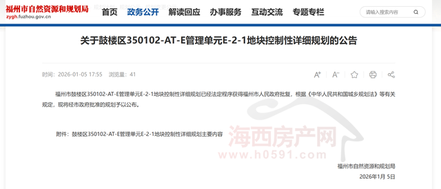 公告显示,福州市鼓楼区350102-AT-E管理单元E-2-1地块控制性详细规划已经法定程序获得福州市人民政府批复,根据《中华人民共和国城乡规划法》等有关规定,现将经市政府批准的规划予以公布。