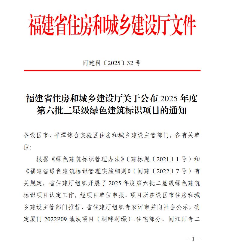 根据《绿色建筑标识管理办法》(建标规〔2021〕1号)和《福建省绿色建筑标识管理实施细则》(闽建〔2022〕7号)有关规定,省住建厅组织开展了2025年度第六批二星级绿色建筑标识项目认定工作。