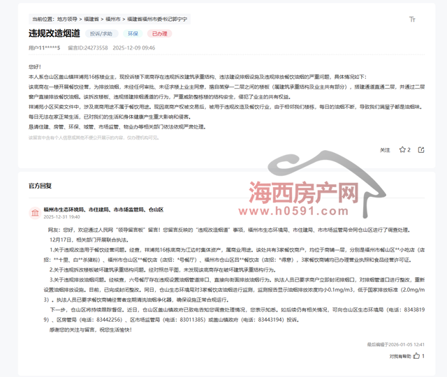 该投诉已于近日得到福州市生态环境局、住建局、市场监管局、仓山区回复: