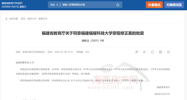 海西房产网(微信公众号:fjhxfcw)消息:1月6日,福建省教育厅发布“关于同意福建福耀科技大学章程修正案的批复(闽教法〔2025〕9号)”。