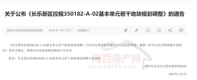 海西房产网(微信公众号:fjhxfcw)消息:2025年1月4日,长乐区自然资源和规划局发布“关于公布《长乐新区控规350182-A-02基本单元若干地块规划调整》的通告”。