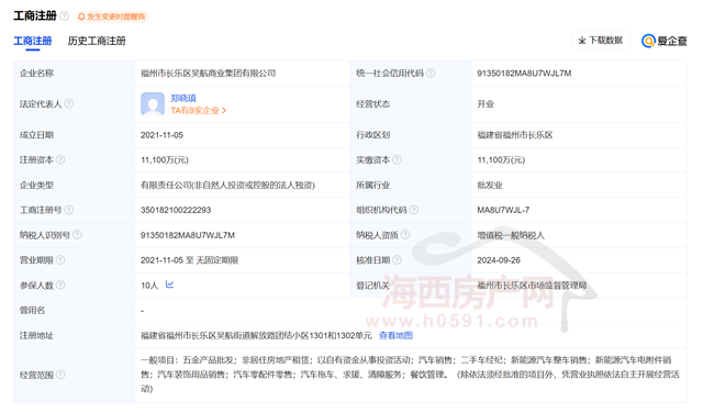 爱企查资料显示,福州市长乐区吴航商业集团有限公司成立于2021年11月05日,注册地位于福建省福州市长乐区吴航街道解放路团结小区1301和1302单元,法定代表人为郑晓瑱。