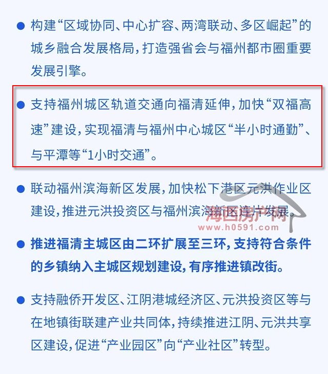 支持福州城区轨道交通向福清延伸,加快"双福高速"建设,实现福清与福州中心城区"半小时通勤",与平潭等"1小时交通"。