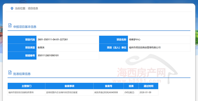 海西房产网(微信公众号:fjhxfcw)消息:福建省投资项目在线审批监管平台公布信息显示,位于福州五四北新盘“得意梦中心”已于2026年1月9日通过备案报建。