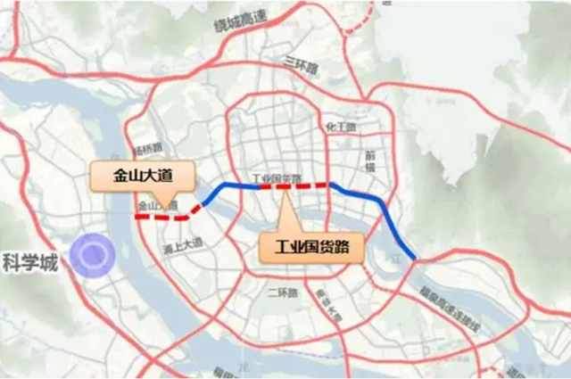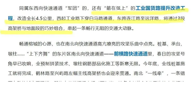 2025年3月份官媒报道透露,工业国货路提升改造工程已“箭在弦上”, 该项目改造全长4.5公里,西起工业路下穿白马路通道,东跨连江路至远洋路,将通过3段高架桥与地面段的巧妙组合,串起一条畅行无阻的交通大动脉。