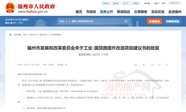 海西房产网(微信公众号:fjhxfcw)消息:近日,福州市发展和改革委员会发布“关于工业-国货路提升改造项目建议书的批复(榕发改审批〔2025〕172号)”。