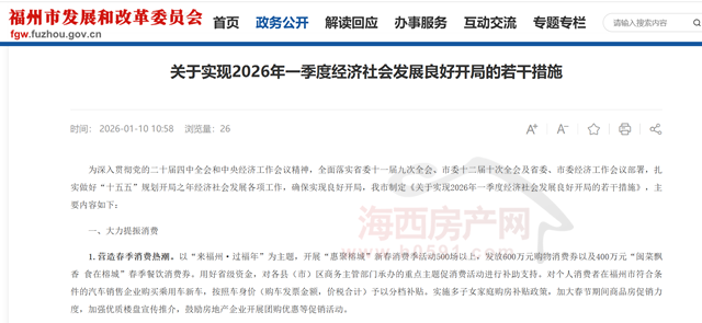 海西房产网(微信公众号:fjhxfcw)消息:1月10日,福州市发改委发布“关于实现2026年一季度经济社会发展良好开局的若干措施”。