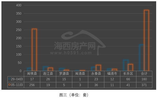 “连江”和“福清”位列四、五两位,上周分别签约19套和11套,环比前一周分别减少7套和1套。