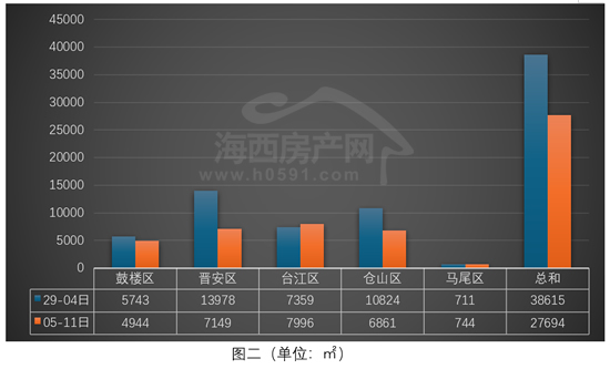 “鼓楼区”和“马尾区”位列四、五两位,上周分别签约43套和7套,相比前一周变化不大。