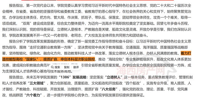 报告确定了新一届党委工作指导思想和奋斗目标。明确着力打造技能型高校“国家队”,提质扩容、申创本科层次职业院校,推动“海陆空轨”专业集群能级跃升,船政文化育人体系更加完善,建成闽台职教融合典范与“海丝学院”品牌,引领全省职教高质量发展。