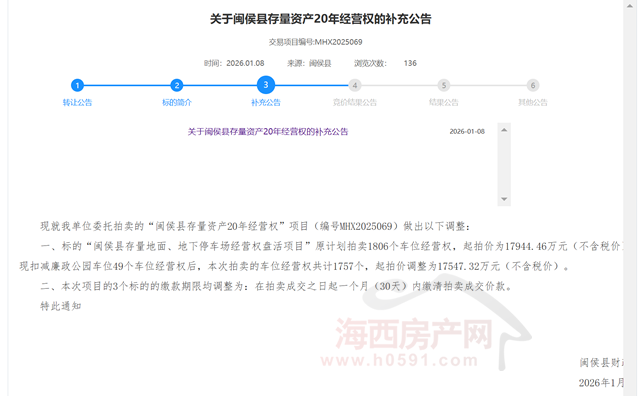 公告针对闽侯县财政局委托拍卖的“闽侯县存量资产20年经营权”项目(编号MHX2025069)做出以下调整: