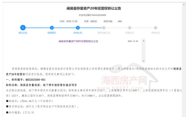 一、标的“闽侯县存量地面、地下停车场经营权盘活项目”原计划拍卖1806个车位经营权,起拍价为17944.46万元(不含税价);现扣减廉政公园车位49个车位经营权后,本次拍卖的车位经营权共计1757个,起拍价调整为17547.32万元(不含税价)。