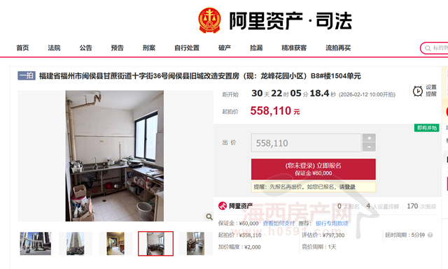 评估价797300元,起拍价558110元,保证金60000元,增价幅度2000元。