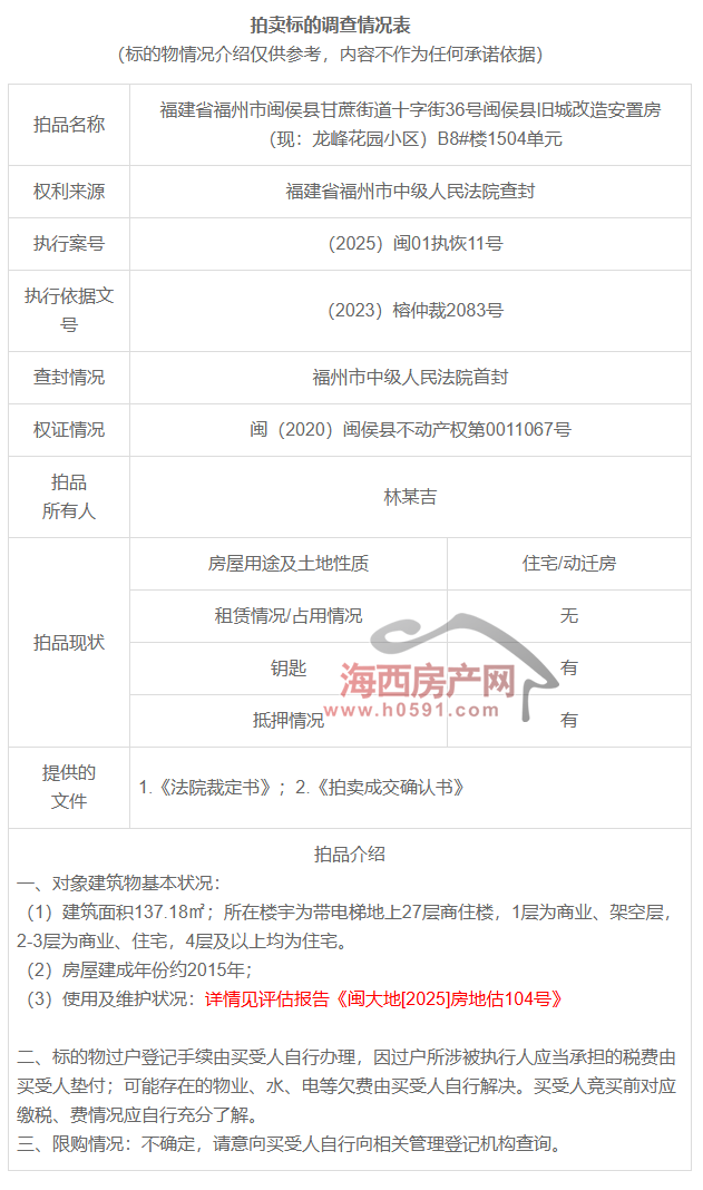 拍卖标的调查情况表显示,本次拍卖的标的所有人为林某吉,建筑面积137.18㎡;所在楼宇为带电梯地上27层商住楼,1层为商业、架空层,2-3层为商业、住宅,4层及以上均为住宅。房屋建成年份约2015年。