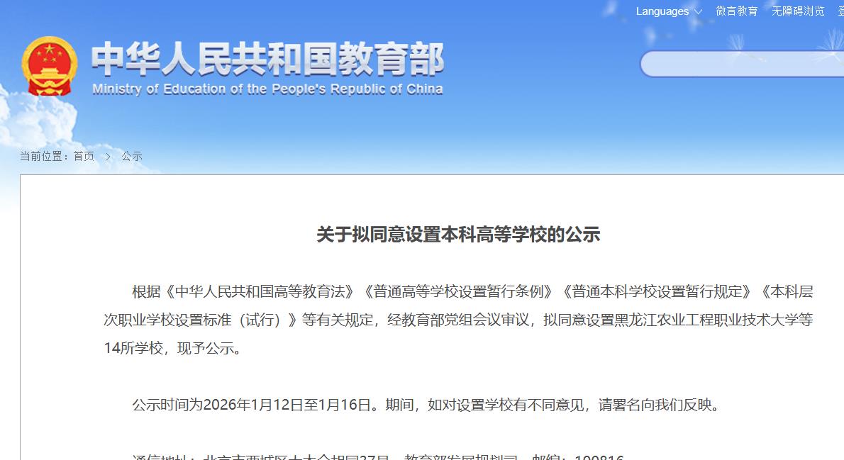 2026年1月12日,教育部发展规划司发布“关于拟同意设置本科高等学校的公示”。