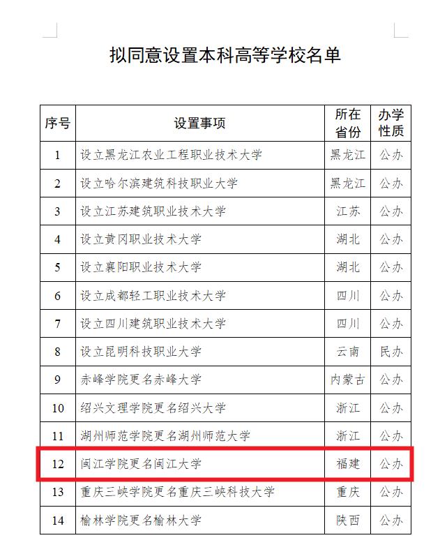 拟同意设置黑龙江农业工程职业技术大学等14所学校,其中拟同意闽江学院更名闽江大学。
