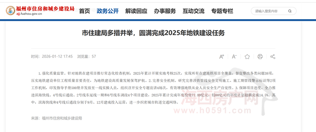 海西房产网(微信公众号:fjhxfcw)消息:1月12日,福州市住房和城乡建设局官网发布一则消息,介绍该局多措并举,圆满完成2025年地铁建设任务。