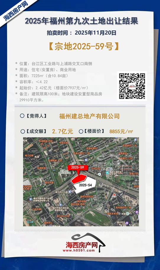 其中,宗地2025-59号(台江区祥坂新村及周边出让地块一),在经过29轮竞价后,由187号竞买人福州建总地产有限公司以2.7亿竞得,楼面地价8855.5元/㎡,,溢价率11.6%
