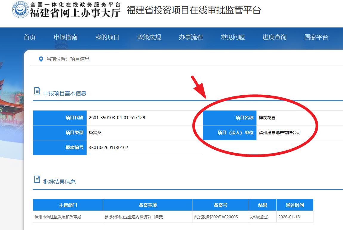 海西房产网(微信公众号:fjhxfcw)消息:福建省投资项目在线审批监管平台发布信息显示,“祥茂花园”已于2026年1月13日取得县级权限内企业境内投资项目备案,批准结果信息为办结(通过)。