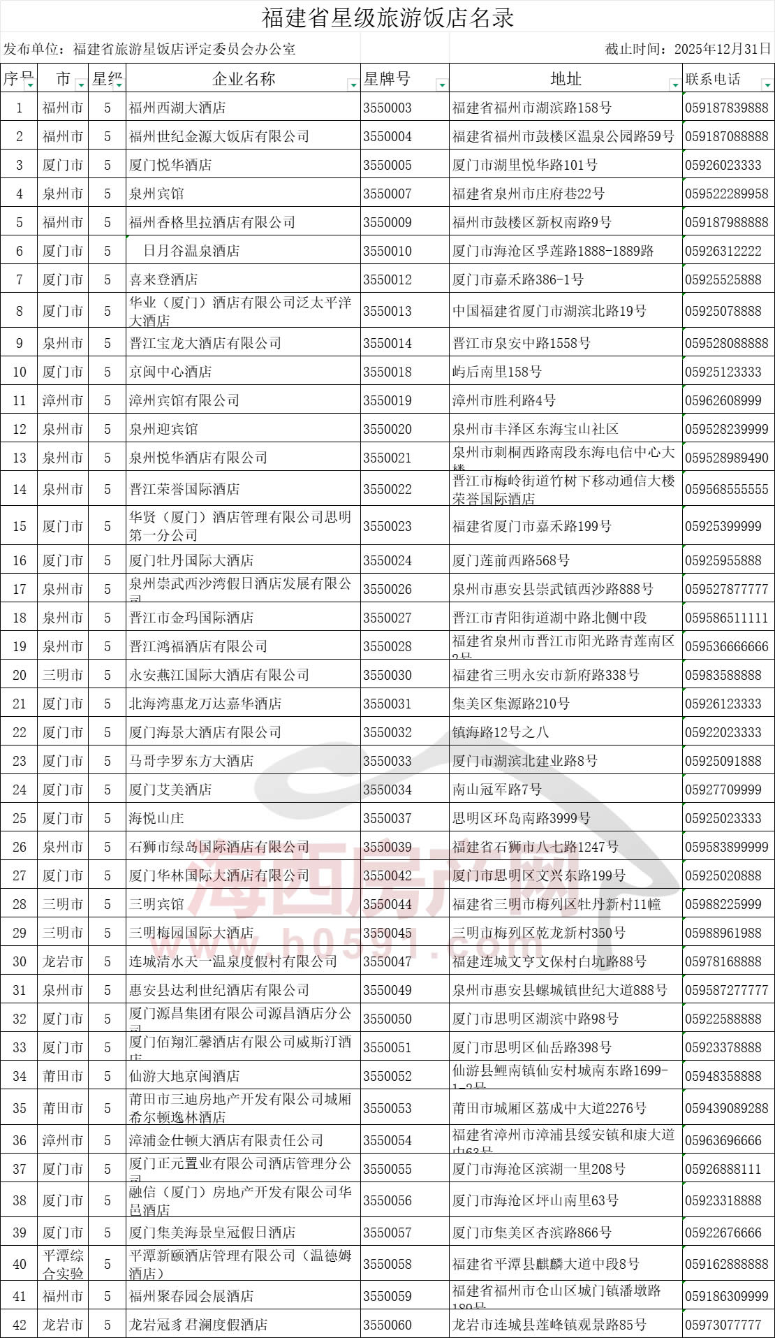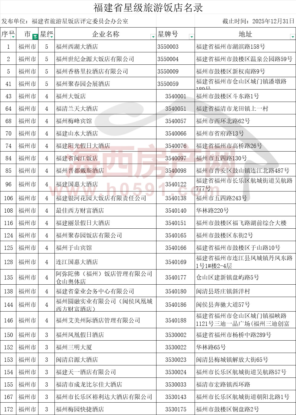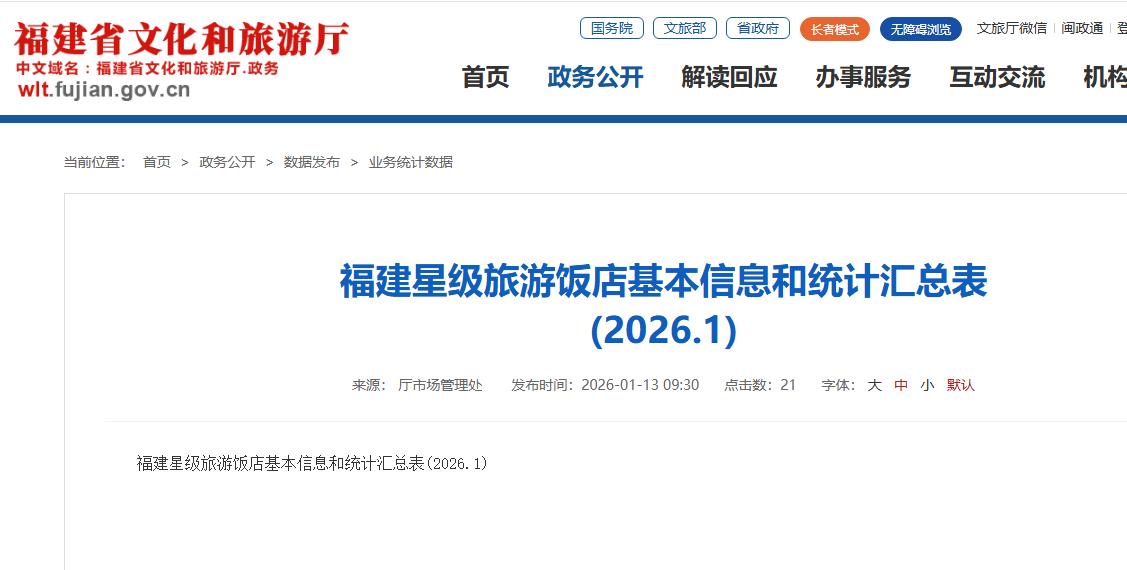 海西房产网(微信公众号:fjhxfcw)消息:2026年1月13日,福建省文化和旅游厅发布“福建星级旅游饭店基本信息和统计汇总表(2026.1)”。