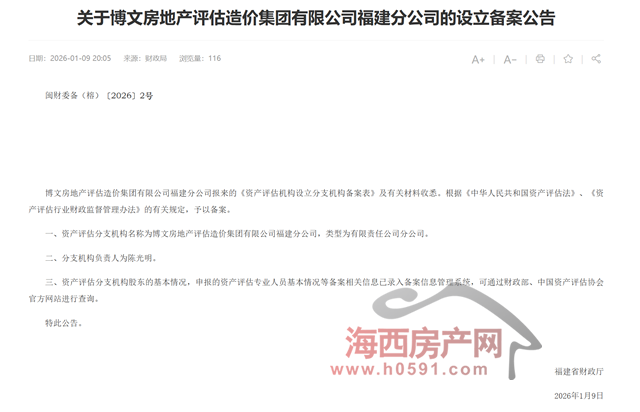 海西房产网(微信公众号:fjhxfcw)消息:1月9日,福建省财政厅发布“关于博文房地产评估造价集团有限公司福建分公司的设立备案公告”。