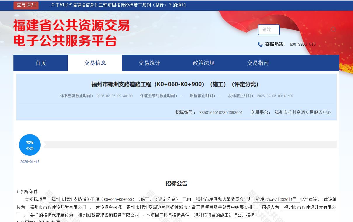 福州市螺洲支路道路工程(K0+060-K0+900)(施工)(评定分离)已由 福州市发展和改革委员会以 榕发改审批[2026]1号批准建设, 建设单位为 福州市市政建设开发有限公司, 建设资金来源 福州市螺洲及周边片区韧性城市改造工程项目资金总盘中统筹安排, 招标人为 福州市市政建设开发有限公司, 委托的招标代理单位为 福州城鑫管理咨询服务有限公司。本项目已具备招标条件,现对该项目的施工进行公开招标。