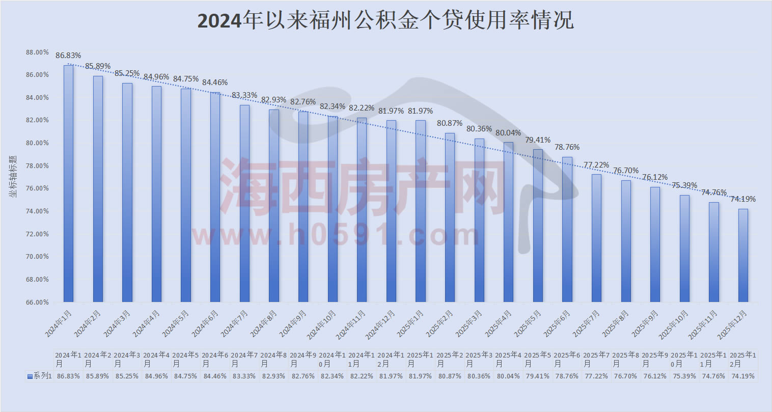 海西房产网统计了2024年1月至2025年12月的福州公积金个贷使用率情况。上月的74.19%,是近24个月以来的新低,已经连续八个月失守80%关口。