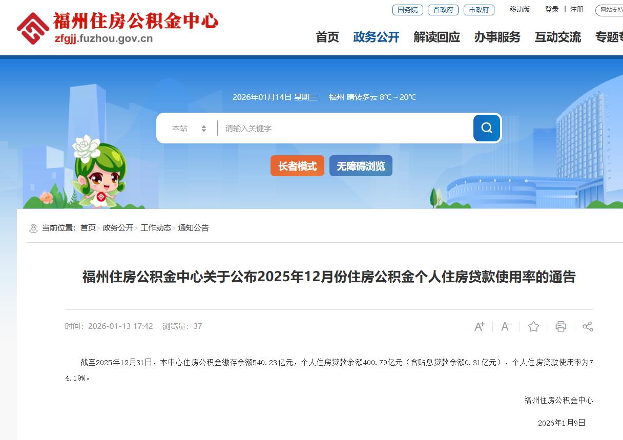 海西房产网(微信公众号:fjhxfcw)消息:2026年1月9日,福州住房公积金中心发布“关于公布2025年12月份住房公积金个人住房贷款使用率的通告”。