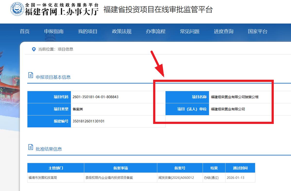 海西房产网(微信公众号:fjhxfcw)消息:福建省投资项目在线审批监管平台发布信息显示,“福建垣荣置业有限公司骏宸公馆”已于2026年1月13日取得县级权限内企业境内投资项目备案,批准结果信息为办结(通过)。