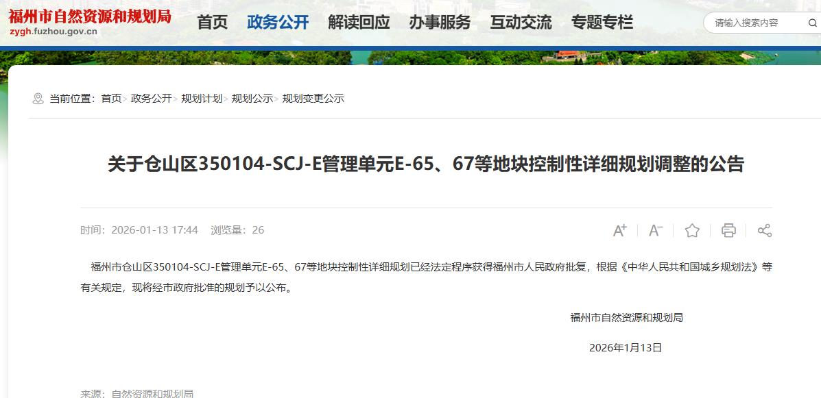 2026年1月13日,福州市自然资源和规划局发布“关于仓山区350104-SCJ-E管理单元E-65、67等地块控制性详细规划调整的公告”。