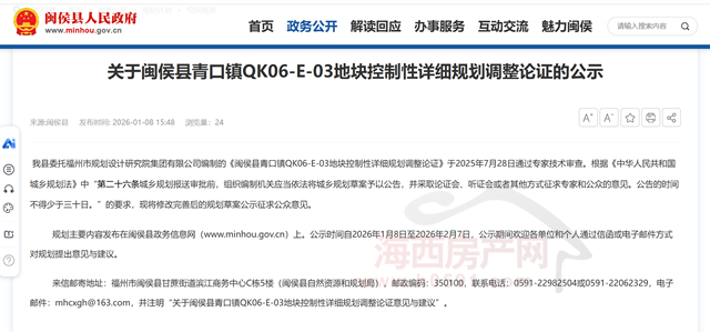公示内容显示,闽侯县委托福州市规划设计研究院集团有限公司编制的《闽侯县青口镇QK06-E-03地块控制性详细规划调整论证》于2025年7月28日通过专家技术审查。