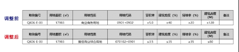 对接QK06-E-03地块意向企业,根据强排方案,拟将QK06-E-03地块由商业商务金融用地(0901+0902)调整为商业居住用地(0901+070102),指标调整为:容积率不高于3.5,建筑密度不高于35%,绿地率不低于35%,建筑高度不高于80M。