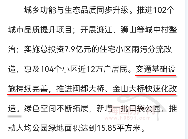 其中包括,持续完善交通基础设施,推进闽都大桥、金山大桥快速化改造。