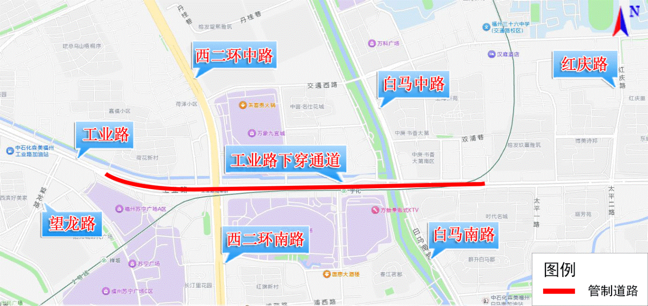 经福州市国防动员办公室申请,因工业路下穿通道修缮施工需要,根据《中华人民共和国道路交通安全法》第三十九条规定,决定从2026年1月18日至施工结束(工期约1个月),每日23时至次日6时,根据施工进展,视情对工业路下穿通道实施临时交通管制,禁止机动车通行。