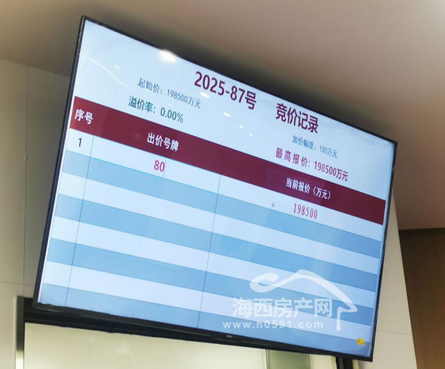 经过1轮竞价,80号竞买人福州新榕筑业工程有限公司以底价198500万竞得福州宗地2025-87号,楼面地价21899.28元/㎡。