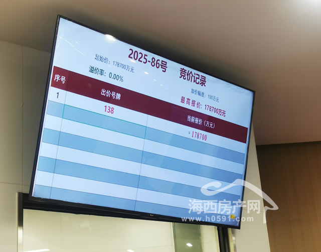 经过1轮竞价,138号竞买人福州建总地产有限公司以178700万竞得福州宗地2025-86号,楼面地价21871.2元/㎡。
