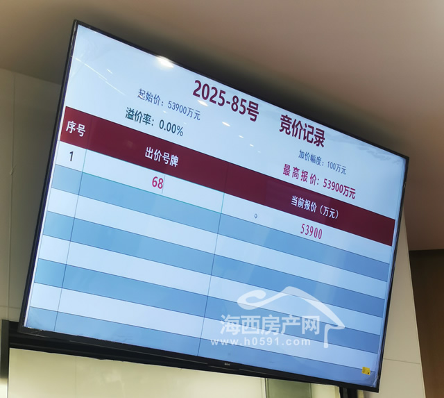 经过1轮竞价,68号竞买人福州市园开安筑建设有限公司(左海)以底价53900万竞得福州宗地2025-85号,楼面地价21244.97元/㎡。