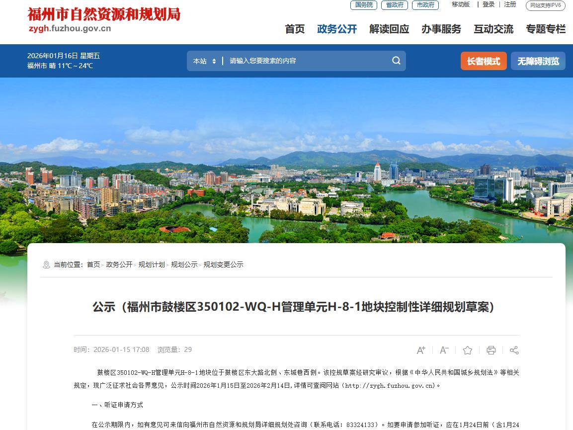 2026年1月15日,福州市自然资源和规划局发布"公示(福州市鼓楼区350102-WQ-H管理单元H-8-1地块控制性详细规划草案)"。