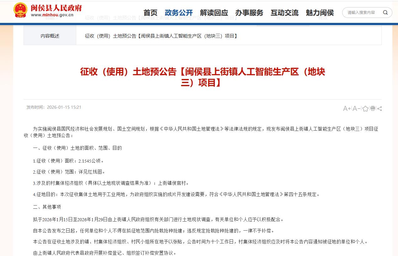 海西房产网(微信公众号:fjhxfcw)消息:2026年1月14日,闽侯县人民政府发布“征收(使用)土地预公告【闽侯县上街镇人工智能生产区(地块三)项目】 ”。