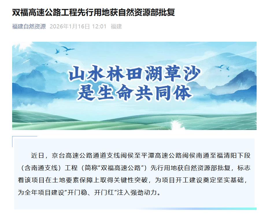 据“福州市自然资源和规划局”1月16日报道,近日,京台高速公路通道支线闽侯至平潭高速公路闽侯南通至福清阳下段(含南通支线)工程(简称“双福高速公路”)先行用地获自然资源部批复,标志着该项目在土地要素保障上取得关键性突破,为项目开工建设奠定坚实基础,为全年项目建设“开门稳、开门红”注入强劲动力。