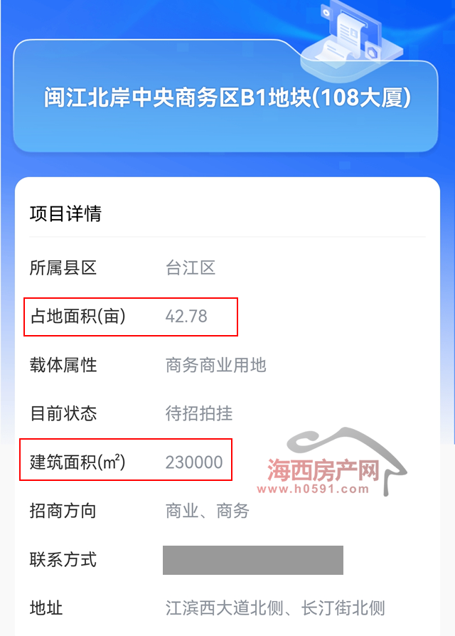 招商清单页面显示,闽江北中央商务区B1地块(108大厦)地块位于江滨西大道北侧,长汀街北侧,规划为文化设施,商业,商务等用地,面积42.78亩。容积率8.2,建筑面积230000㎡,主要招引现代商贸,服务业等产业。