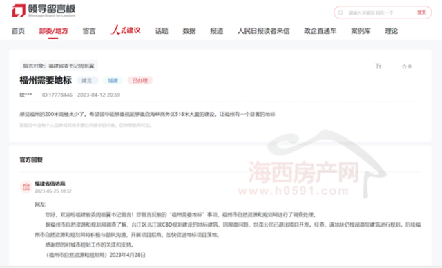 2023年5月,福州市自然资源和规划局表示,台江区北江滨CBD规划建设的地标建筑,虽因限高问题导致世茂公司退出项目开发,但该地块仍按超高层建筑进行规划。后续,福州市相关部门将积极与部队沟通,开展项目招商,加快促进地标项目落地。