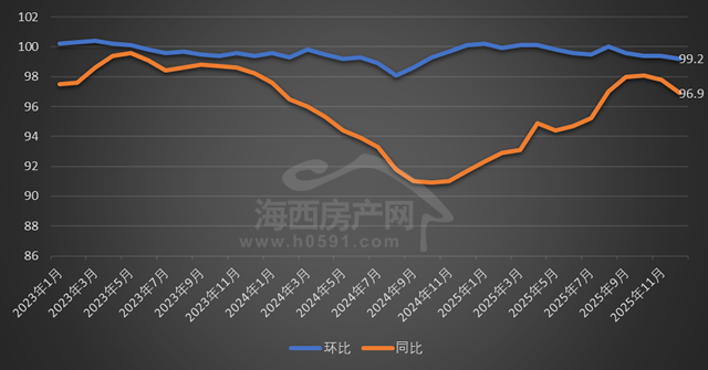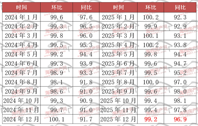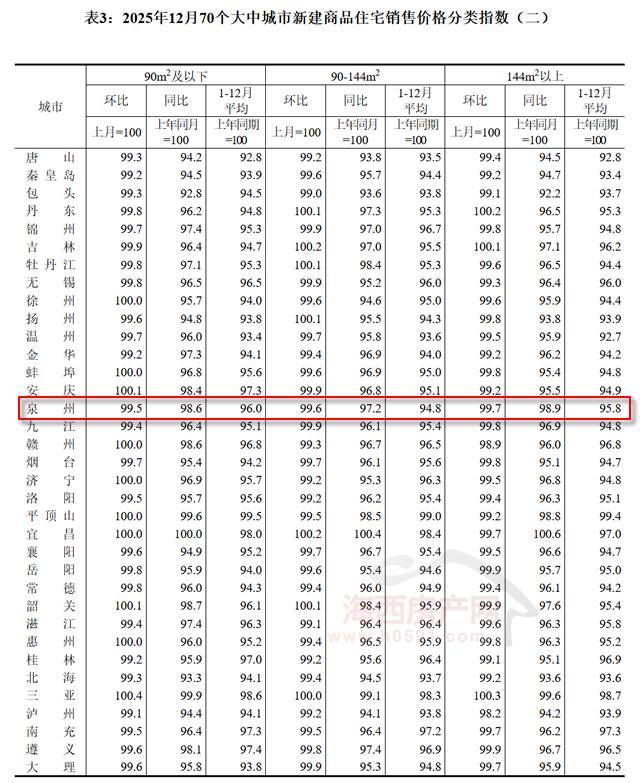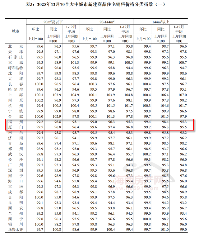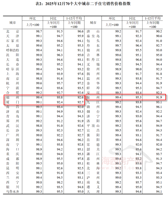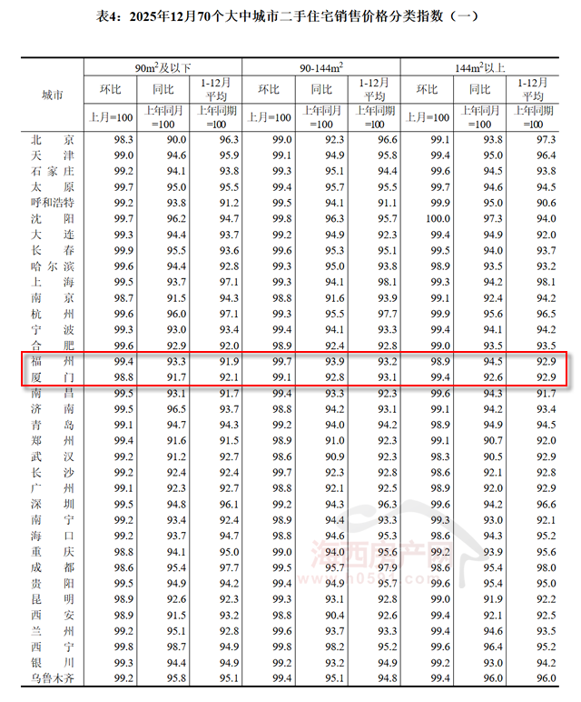 国家统计局数据显示,2025年12月福州新建商品住宅销售价格环比下跌0.8%,同比下跌3.1%;厦门环比下跌0.5%,同比下跌3.1%;泉州环比下跌0.4%,同比下跌2.3%。