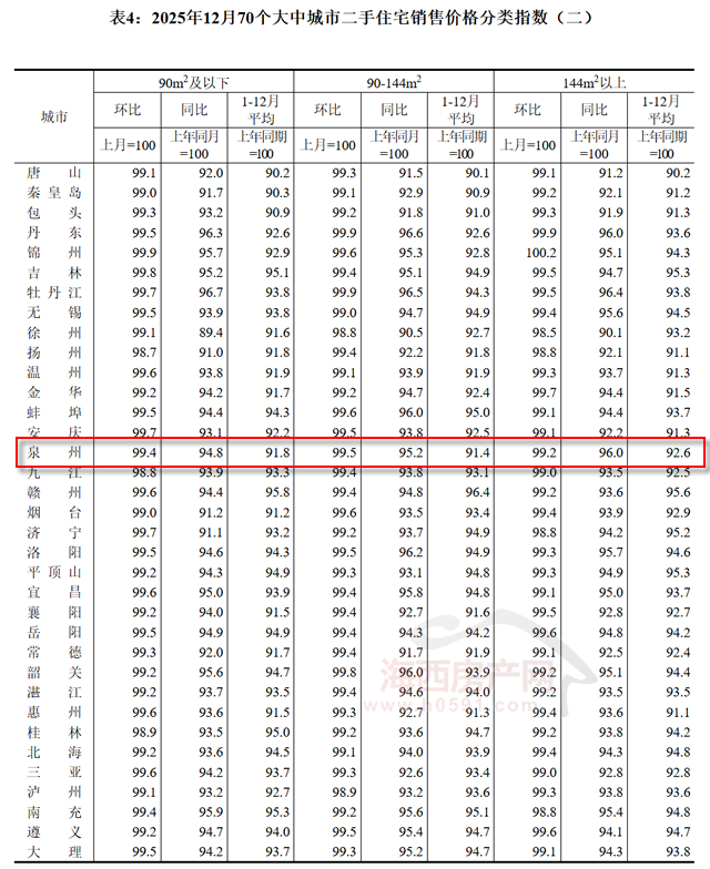 在面积段方面,12月份福州90㎡以下新建商品住宅销售价格环比下跌0.8%,同比下跌3.2%;厦门环比下跌0.5%,同比下跌3.2%;泉州环比下跌0.5%,同比下跌1.4%。